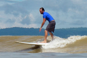 "At the Pavones break and with the help of your instructors, I was able to grasp and understand where one should be to be in the position to catch a wave. On previous breaks, it was not easy to 'see' where the waves were breaking or which way they were breaking. The rolling sets at Pavones, along with an instructor's eye and indication, allowed me to 'see' where the wave needed to be for me to know I was 'in' position. The waves at Pavones were a great size for a beginner. In addition, what a godsend it is for someone who does not have 'in shape' arms to have a manageable distance to paddle out to the break.
